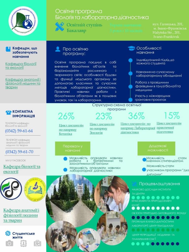 Колективи кафедри біології та екології і кафедри анатомії та фізіології людини та тварин Факультету природничих наук Прикарпатського національного університету імені Василя Стефаника запрошують на навчання на ОП “Біологія та лабораторна діагностика” спеціальності 091 Біологія ОР “бакалавр”. Освітня програма поєднує в собі вивчення біологічних об’єктів та біорізноманіття рослинного і тваринного світів; особливості будови та функції людського організму за допомогою класичних та сучасних методів лабораторної діагностики. В ході навчання Ви отримаєте практичні навички роботи з біологічними об’єктами як в польових умовах, так і в лабораторних, що дасть змогу отримати омріяний фах та високооплачувану роботу!