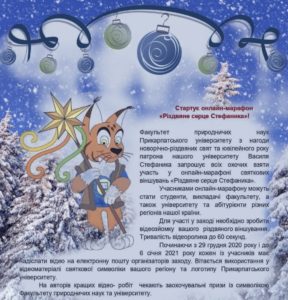 Факультет природничих наук Прикарпатського університету з нагоди новорічно-різдвяних свят та ювілейного року патрона нашого університету Василя Стефаника запрошує всіх охочих взяти участь у онлайн-марафоні святкових віншувань «Різдвяне серце Стефаника». Учасниками онлайн-марафону можуть стати студенти, викладачі факультету, а також університету та Читати далі