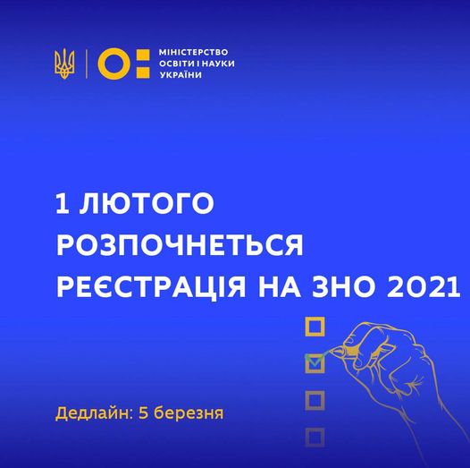 Реєстрація для участі у зовнішньому незалежному оцінюванні 2021 розпочнеться 1 лютого і триватиме до 5 березня. Такий термін встановлює календарний план підготовки та проведення ЗНО 2021 року, затверджений наказом МОН від 30.09.2020 №1210.