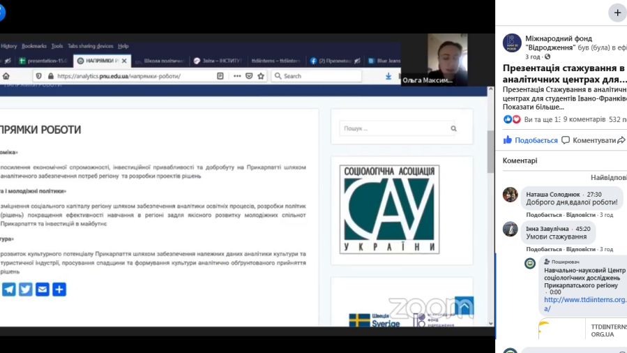 «Це п’ята хвиля стажування молоді в провідних аналітичних центрах країни. Центр Прикарпатського університету є з 2021 року одним з 24 аналітичних центрів-учасників «Ініціативи з розвитку аналітичних центрів» в Україні. Вперше на Прикарпатті, маємо інституцію, що є приймаючою стороною програми стажувань молоді в аналітичних центрах. Це виняткова можливість для талановитих молодих аналітиків здобути професійний досвід, налагодити партнерські взаємини із колегами, перебуваючи тут, в Івано-Франківську» – розповідає директорка Центру соціологічних досліджень Прикарпатського національного університету Ольга Максимович.
