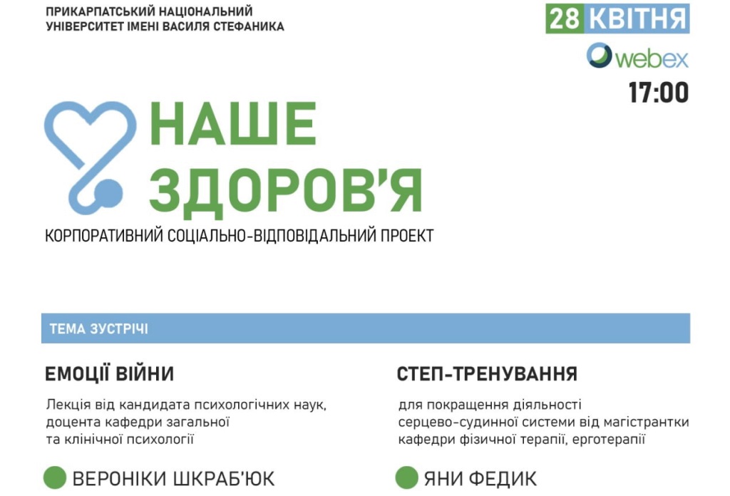 Чергова онлайн-зустріч відбудеться 28 квітня о 17:00 год. у рамках корпоративного соціально-відповідального проєкту “Наше здоров’я”.